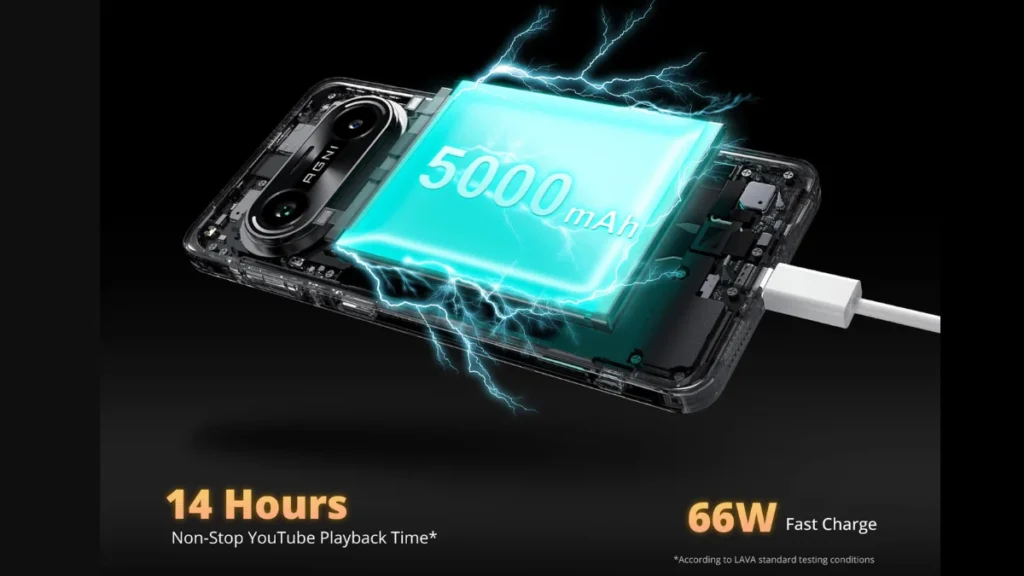 Lava Agni 4 supports 66 W wired fast charging via USB‑C, and the bundled charger is provided in the box. The company claims that the phone can charge from 0 to 50 percent in under about 19 minutes, and from 0 to 100 percent in roughly 50–55 minutes under ideal conditions.